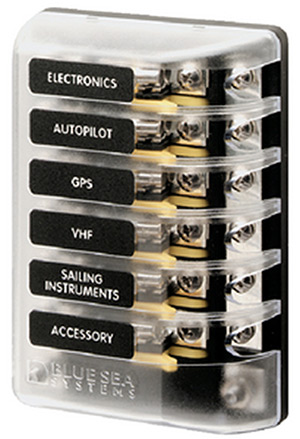 462-661-5015 Clear insulating cover with label recesses for standard Blue Sea System labels. Cover insulates all conductive parts, satisfying ABYC/USCG requirements and stores spare fuses. Nickel-plated metal components and copper contact clips. Rated for 32V max, 100 amps max per block, 30 amps max per circuit. Uses AGC, MDL and all other 3AG glass fuses.
